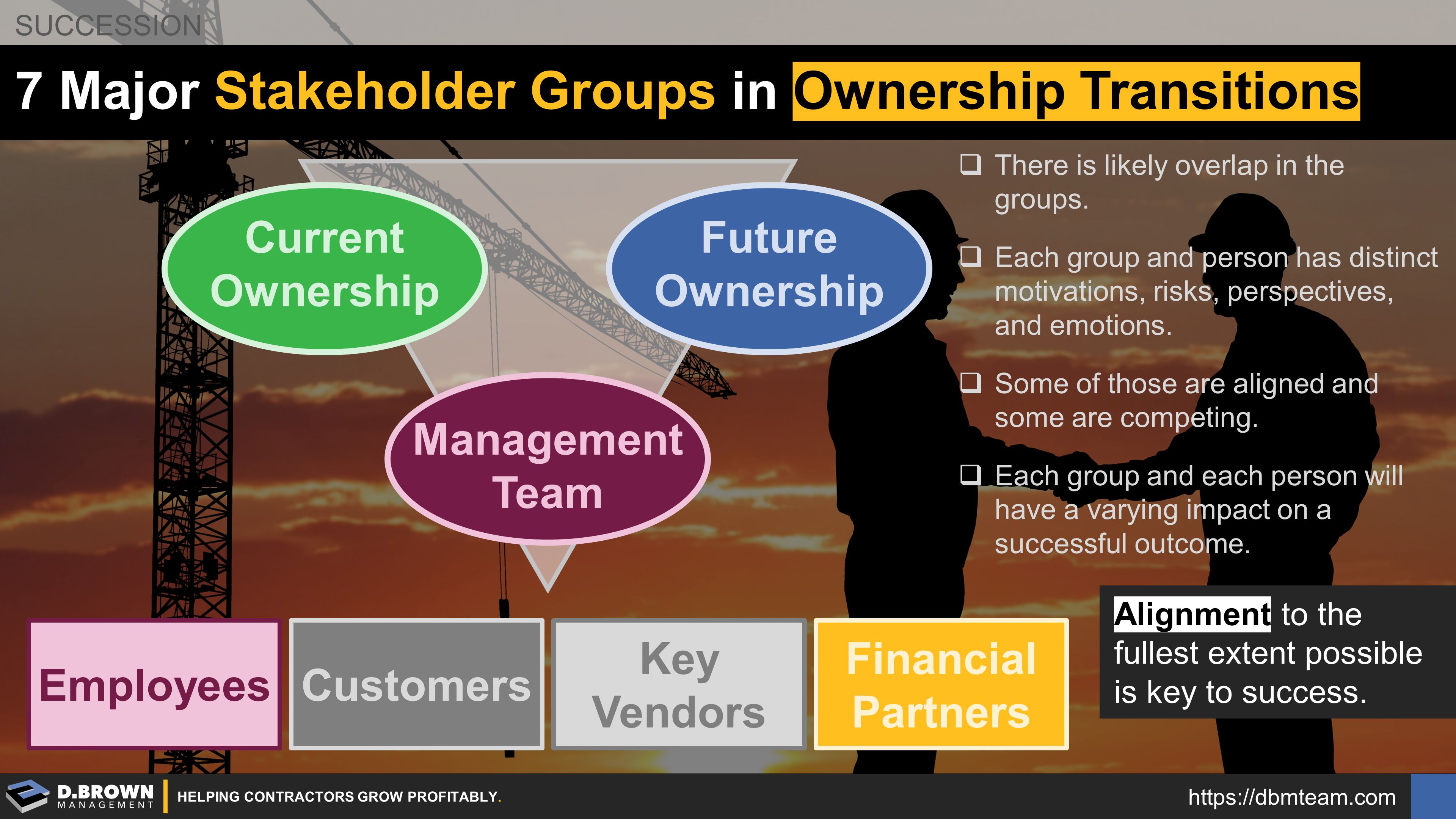 - Financial Partners: Including banking, surety, and insurance. Depending on how much capital is involved, their history with the management team and future owners, this can shape the deal terms and constrain profitable future growth. It can also extend the time that current owners remain at risk.