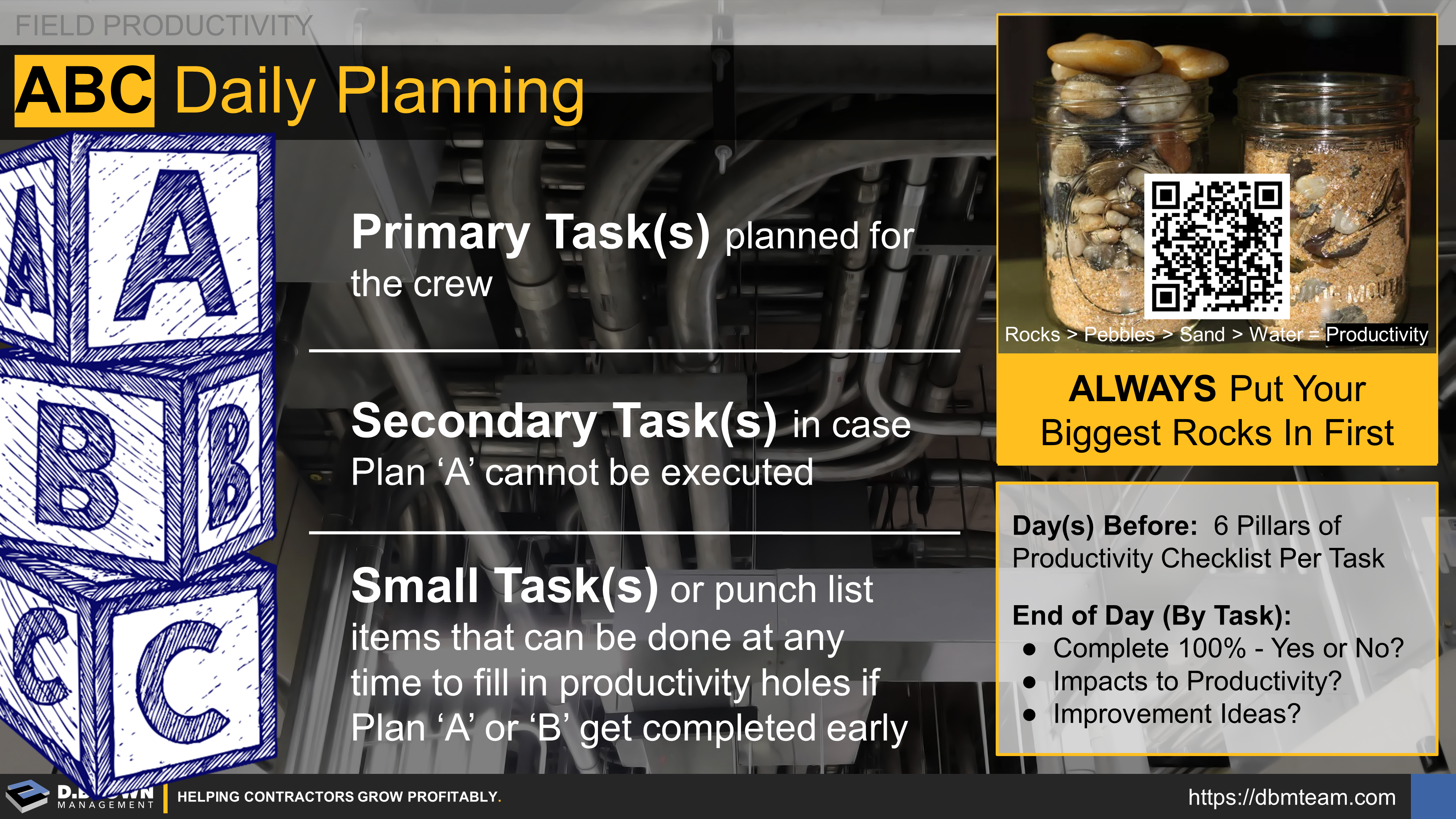 Field Productivity: The ABC's of Daily Planning. (A) Primary tasks planned for the crew. (B) Secondary tasks in case plan 'A' cannot be executed. (C) Small tasks or punch list items that can be done at any time to fill in productivity holes if Plan 'A' or 'B' get completed early. Days before: 6 Pillars of Productivity checklist per task. End of Day (By Task): Complete 100% Y/N, Impacts to Productivity? Improvement Ideas? Always put your biggest rocks in first.