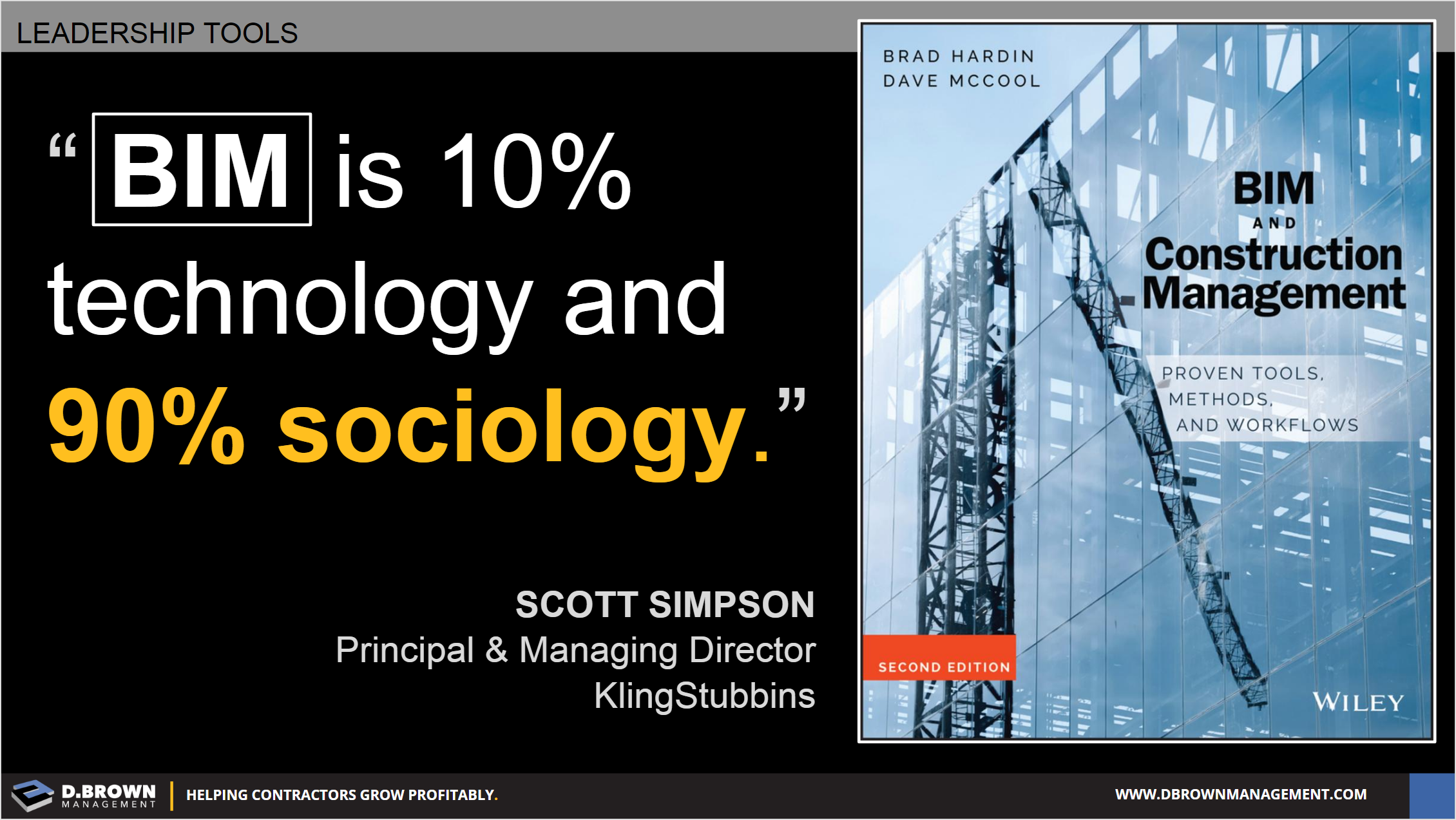 Leadership Tools: Quote: BIM is 10% technology and 90% sociology. Scott Simpson. Book: BIM and Construction Management by Brad Hardin and Dave McCool.