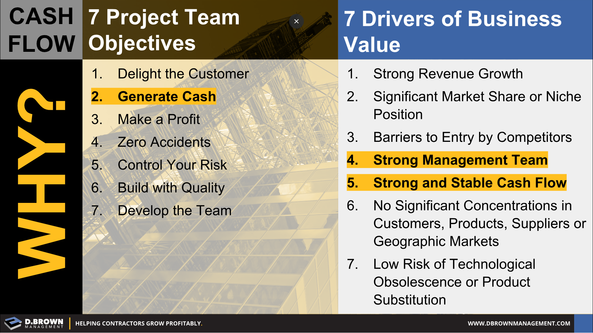 Cash flow is one of the 7 basic objectives of a construction project team and one of the 7 drivers of contracting business valuation.