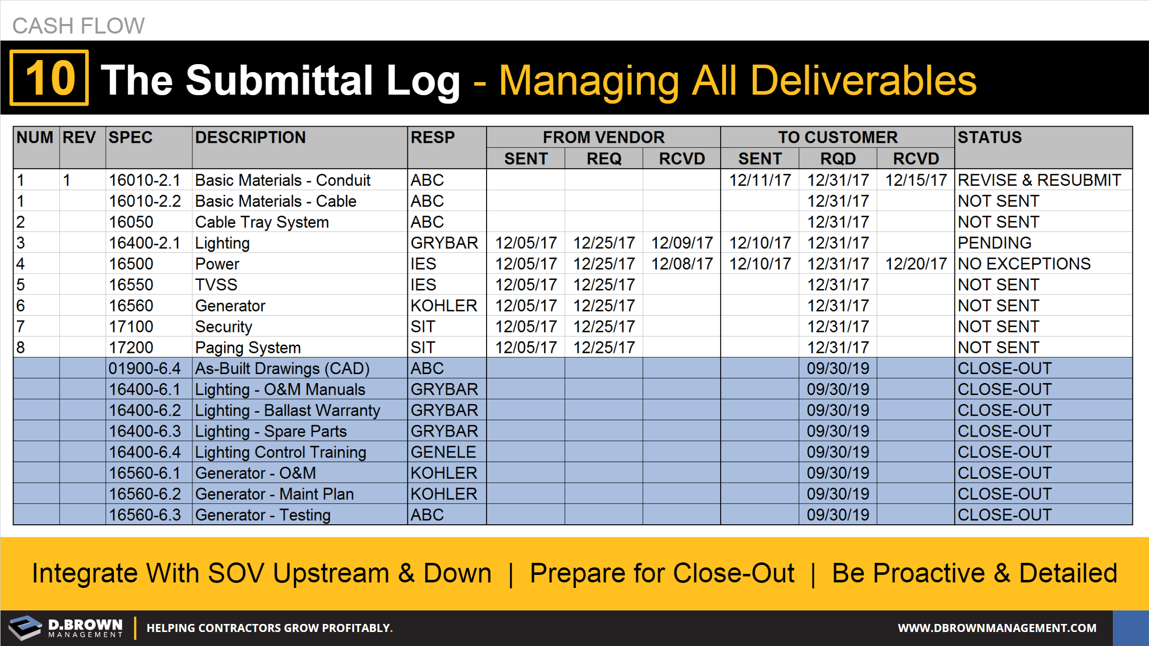 Start by creating a very detailed log that includes not only submittals, but every close-out requirement in the specifications for you and any of your downstream vendors or subcontractors. Remember that slow close-out will hold up the last 10-15% of your cash flow on the project.