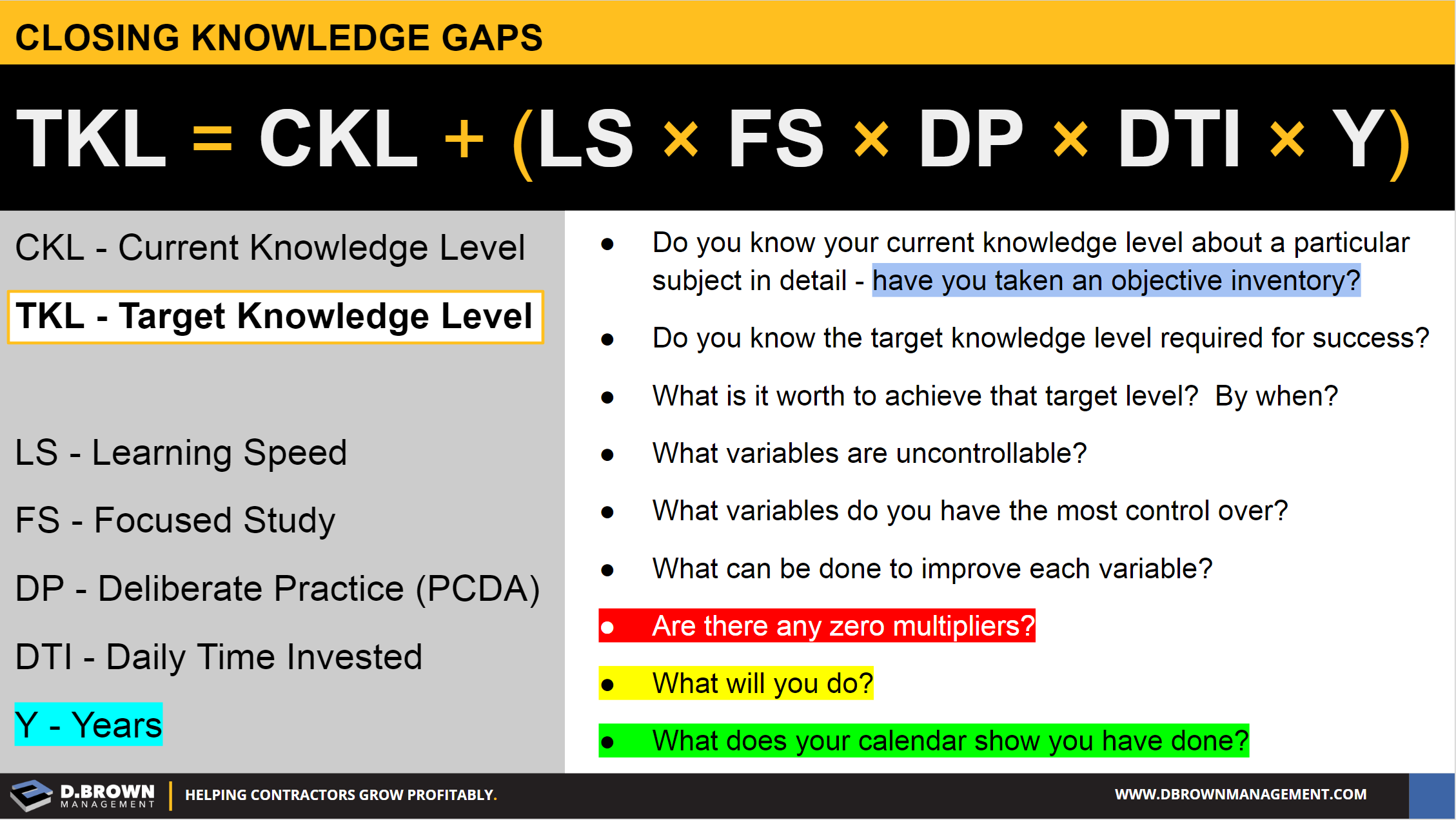 Closing Knowledge Gaps: Target Knowledge Level equals Current Knowledge Level plus LS x FS x DP x DTI x Y.