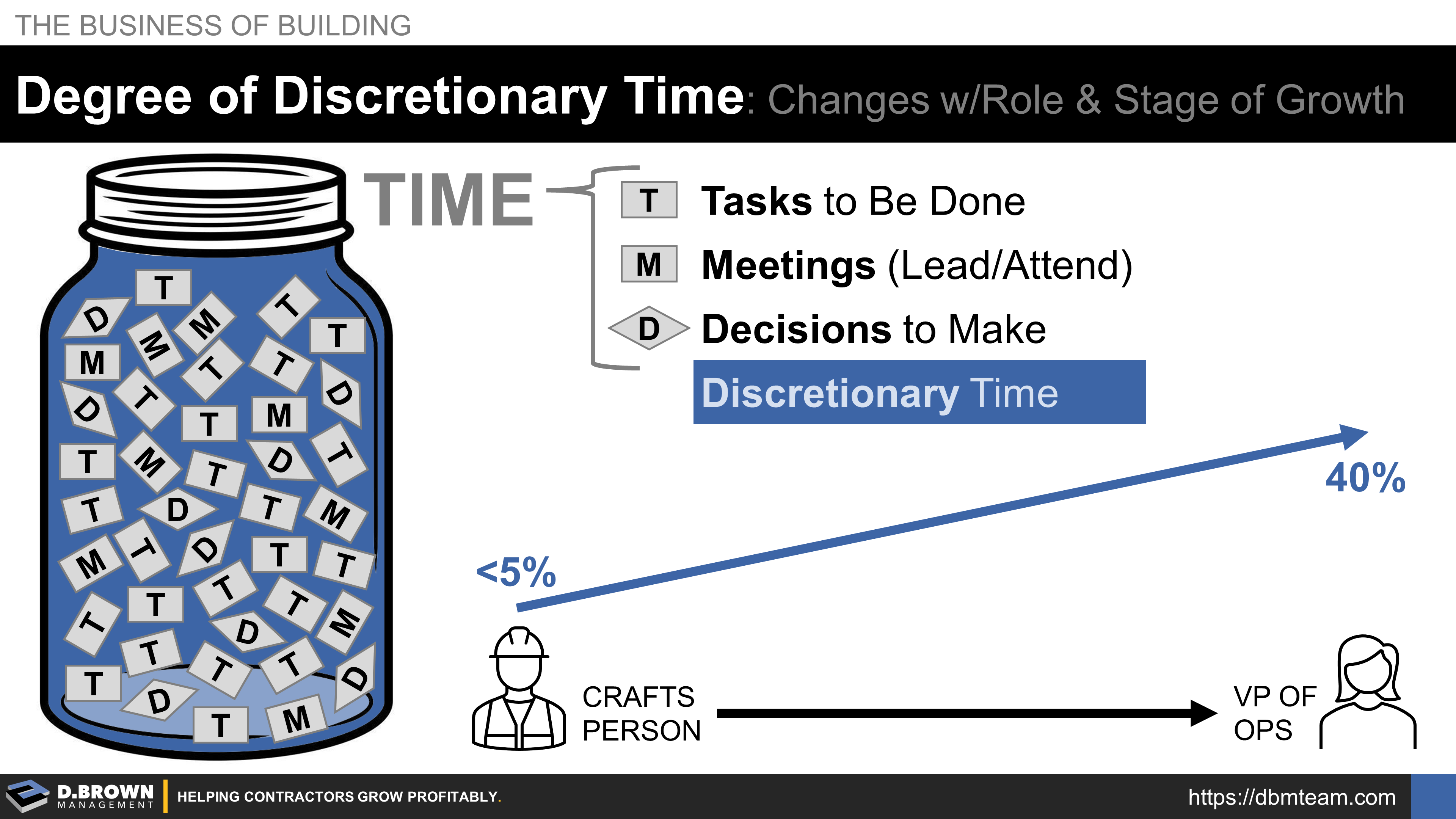 As a contractor grows through different stages of growth, similar job roles will have progressively less discretionary time as the role gets more clearly defined. For example, an Operations Manager who is the first to hold that role in a stage 2 or 3 sized company will likely be defining the role while doing it - nearly 100% discretionary time.