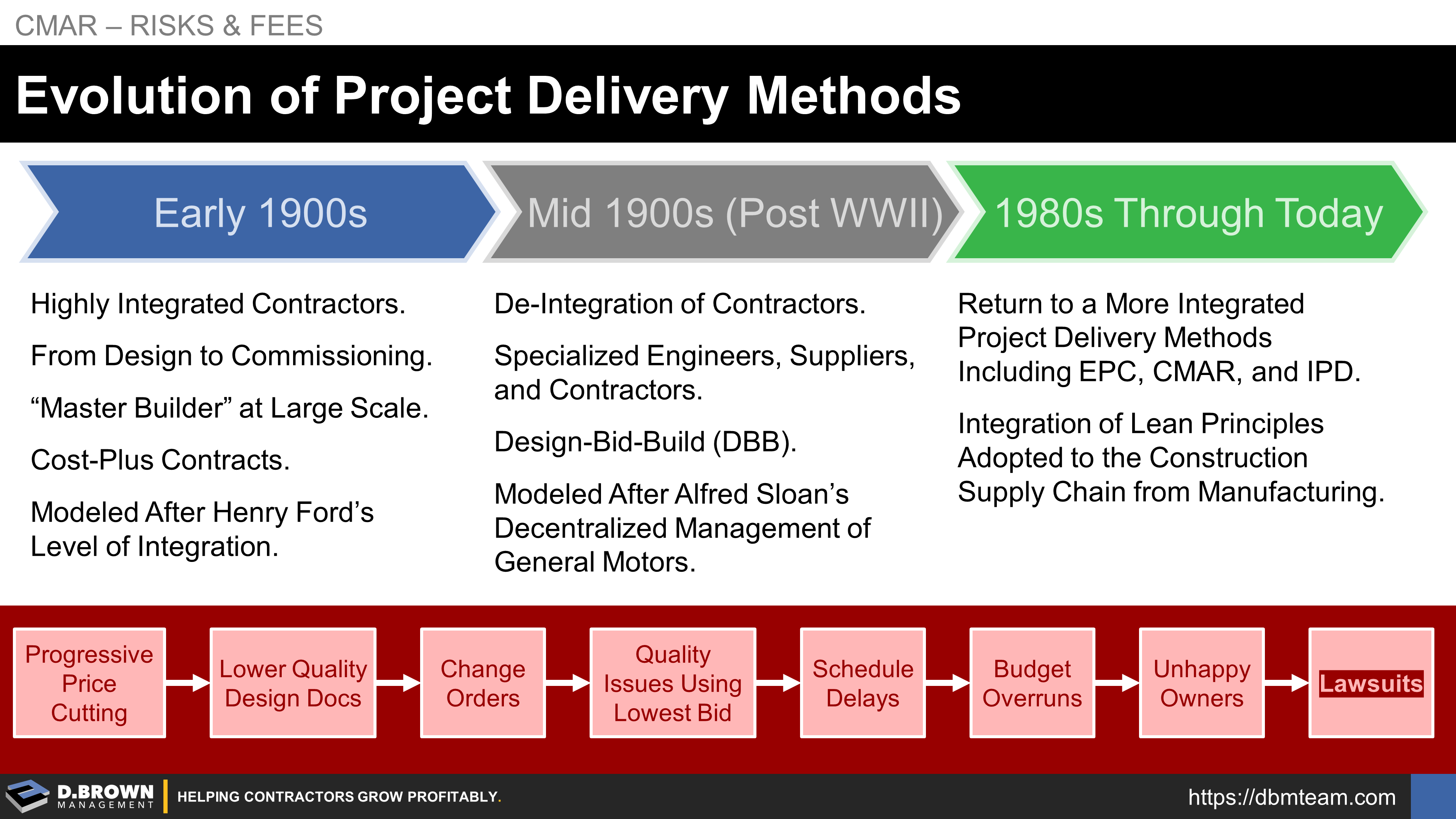 The mid-1900s post WWII brought in a focus of specialization and cost controls as many industry sectors and companies reached maturity. Their strategies and business models from first-mover advantage toward stability. The construction industry as a whole followed with the de-integration of contractors towards more specialized engineers, suppliers, and contractors. This was modeled heavily after Alfred Sloan's decentralized management of General Motors and the Design-Bid-Build (DBB) project delivery method became widely used.