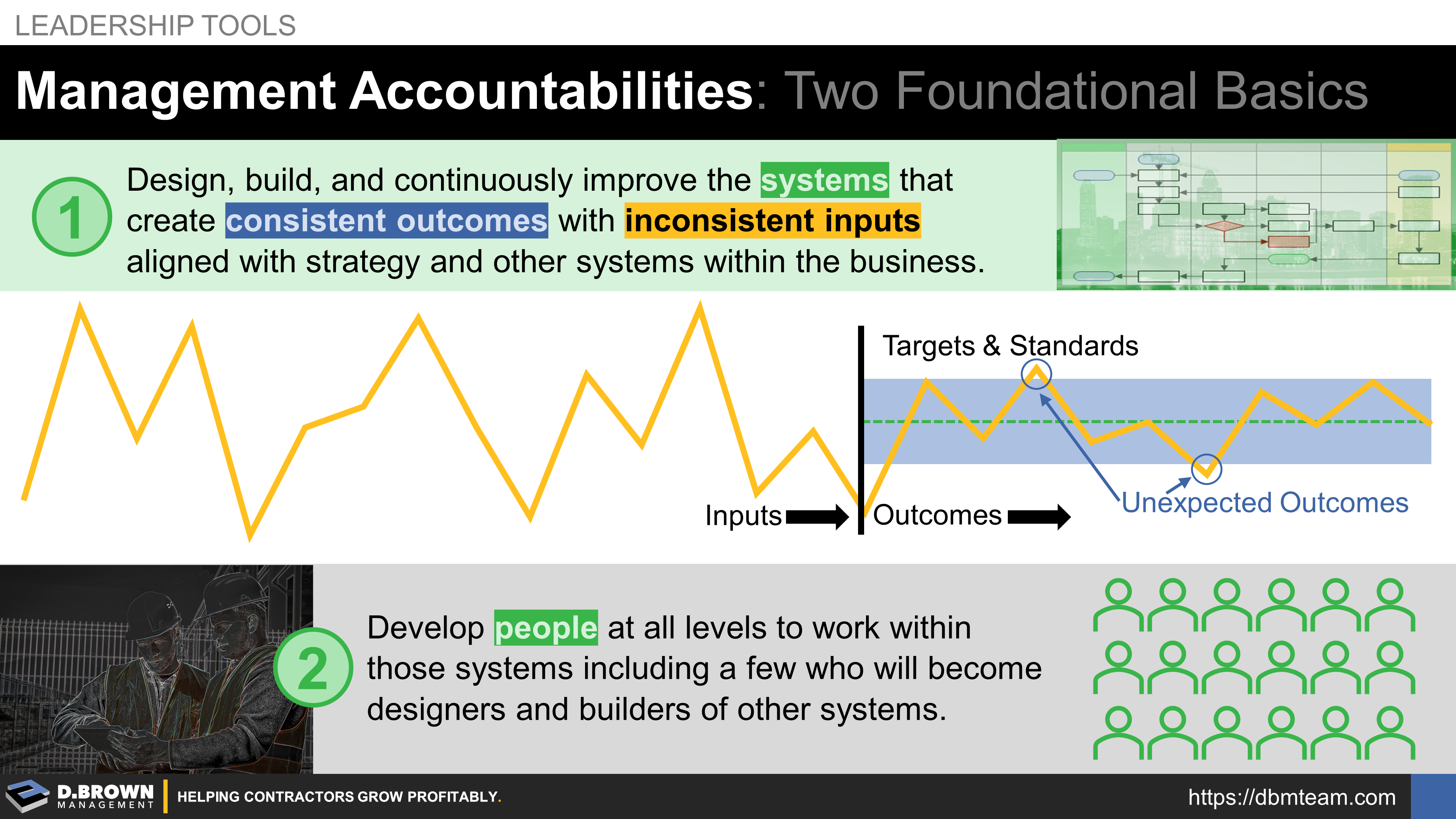 These critical assumptions form the highest levels of standards for the contractor. The "Business of Building" is about designing the systems that will most consistently achieve these standards within a tolerance range for all areas of the business. This is where management starts to break these down into more specific assumptions and metrics for their functional area.