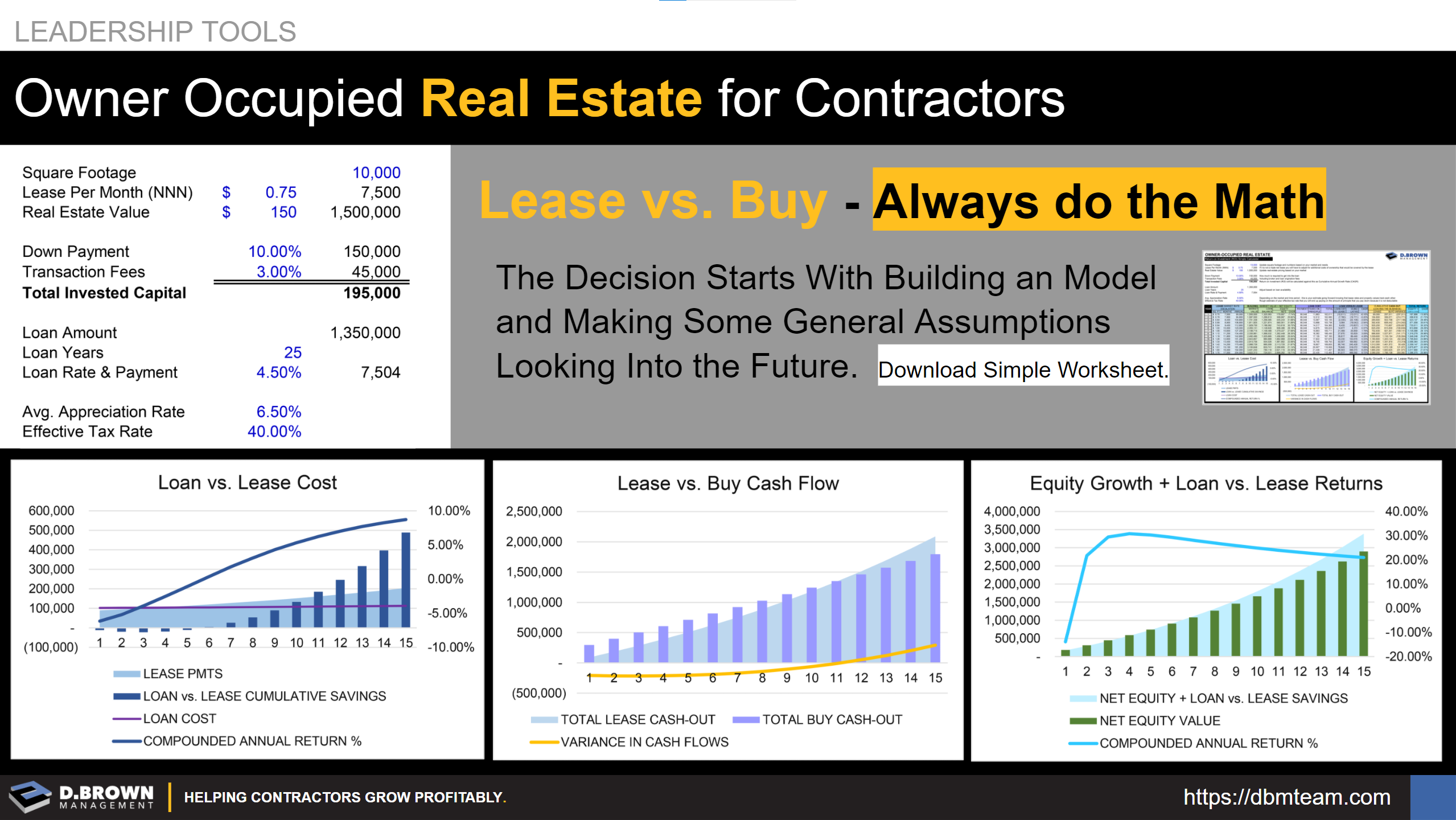 Disclaimer - This model is not perfect or built for all situations. It will give you a starting point to build upon. As you make a decision like this, run multiple scenarios and create additional tabs for backup. Don't hesitate to schedule some time to talk through this. We are not tax or real estate experts - our advice will be from the perspective of sustainably and profitably growing a construction business over the long-term.