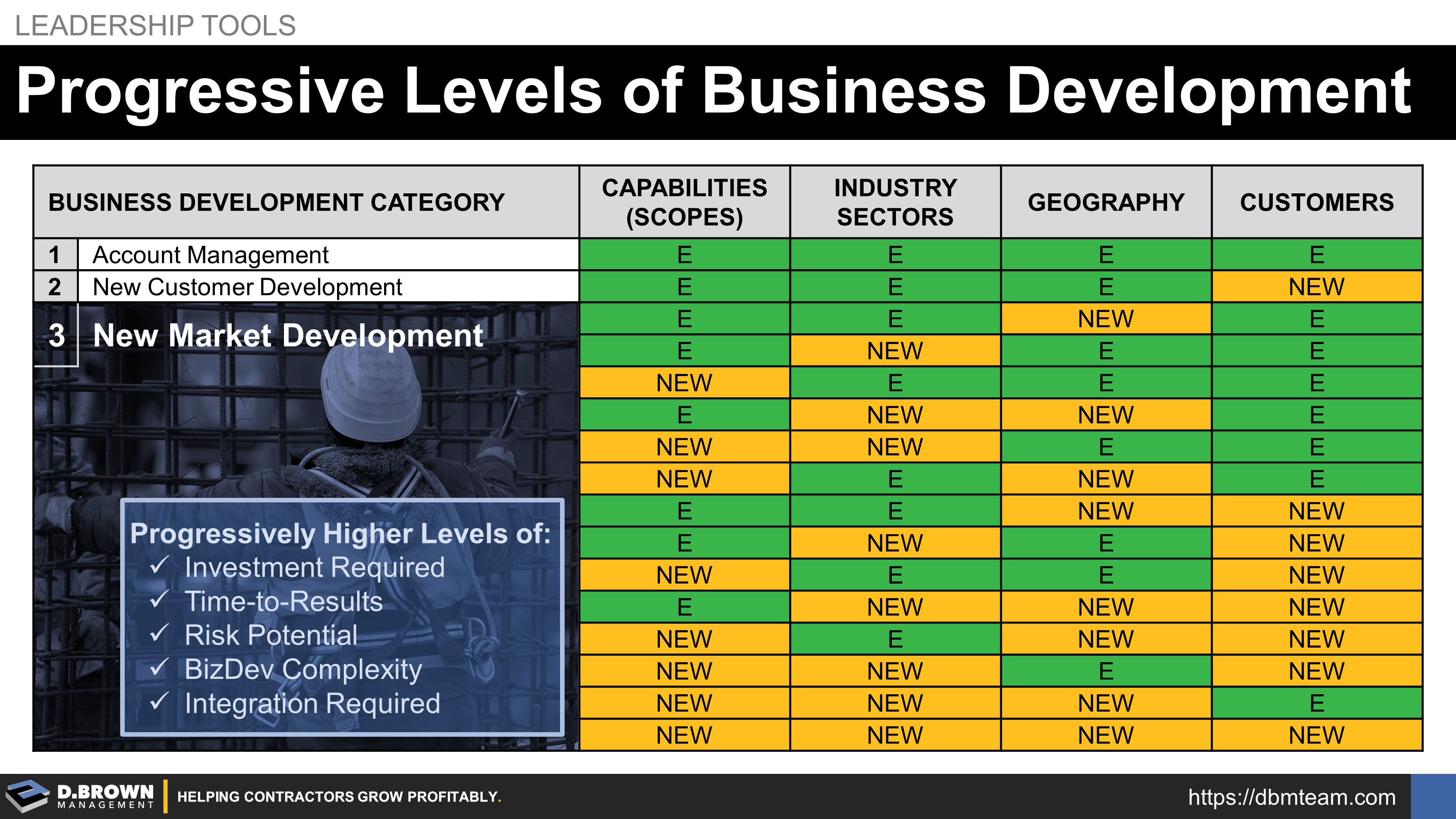 - New Customer Development (Existing Markets): This is a combination of an operational support and a strategic support function. The biggest difference is "Degree of New" for the customer. For instance, if you make ice and currently sell ice to customers in Arizona then identifying and selling to new customers in Arizona is very different than if you had a crazy strategy on how to "Sell Ice to Eskimos" in which case that would be more of a strategic support function. There are usually many times more customers in existing markets than a contractor knows. It is one of the four truths of business development.