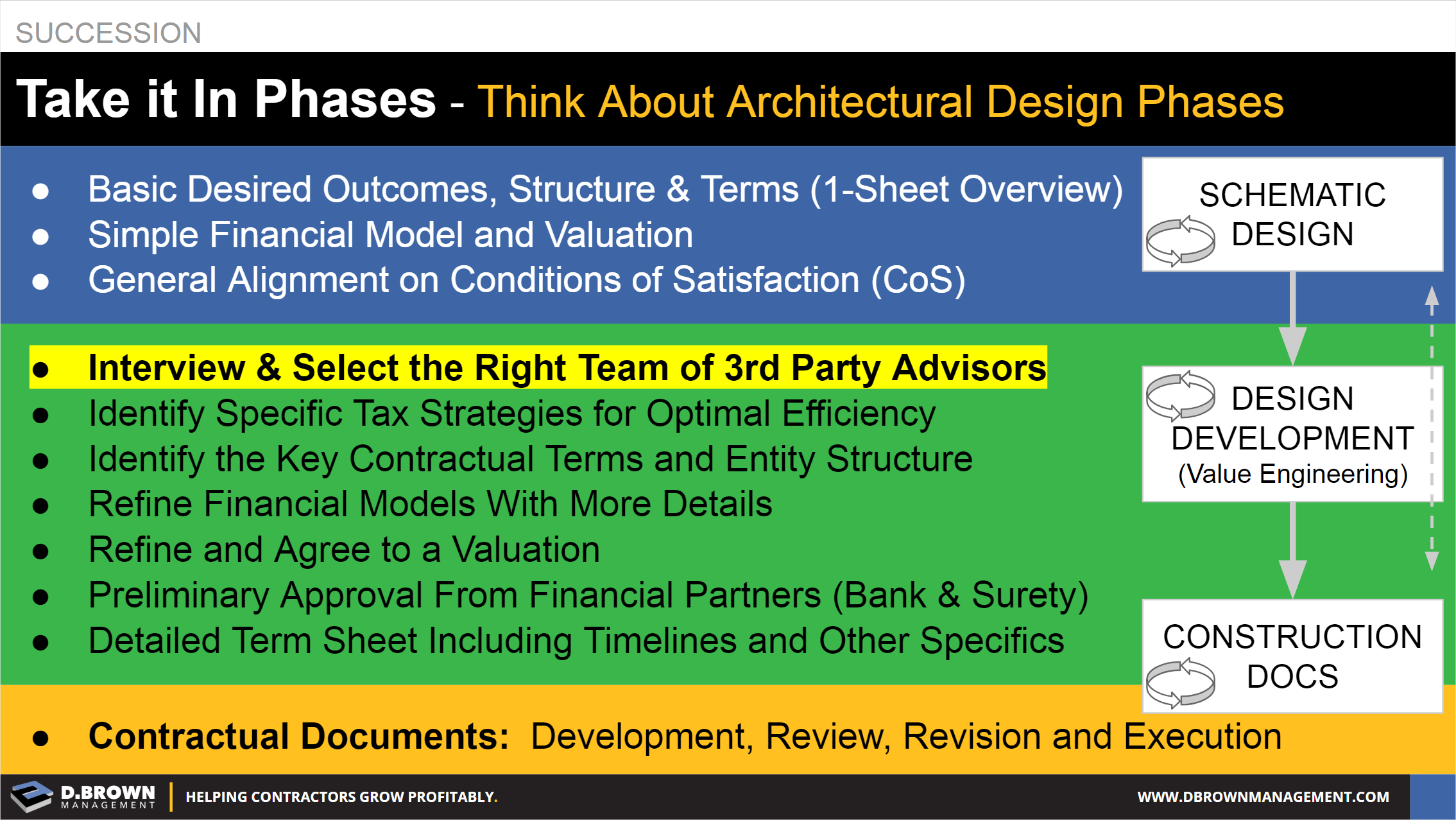 Succession: Take it in Phases. Think about architectural design phases. Schematic design, design development, and construction documents.