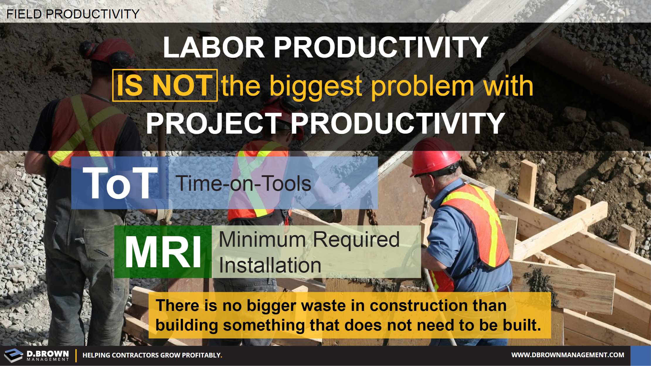 - Maximize Time-on-Tools (ToT): Ensure that crafts people spend most of their day working with their tools actually installing things. Different studies place the industry average between 50-65%. Leverage the 6 Pillars of Productivity and ABC Daily Planning.