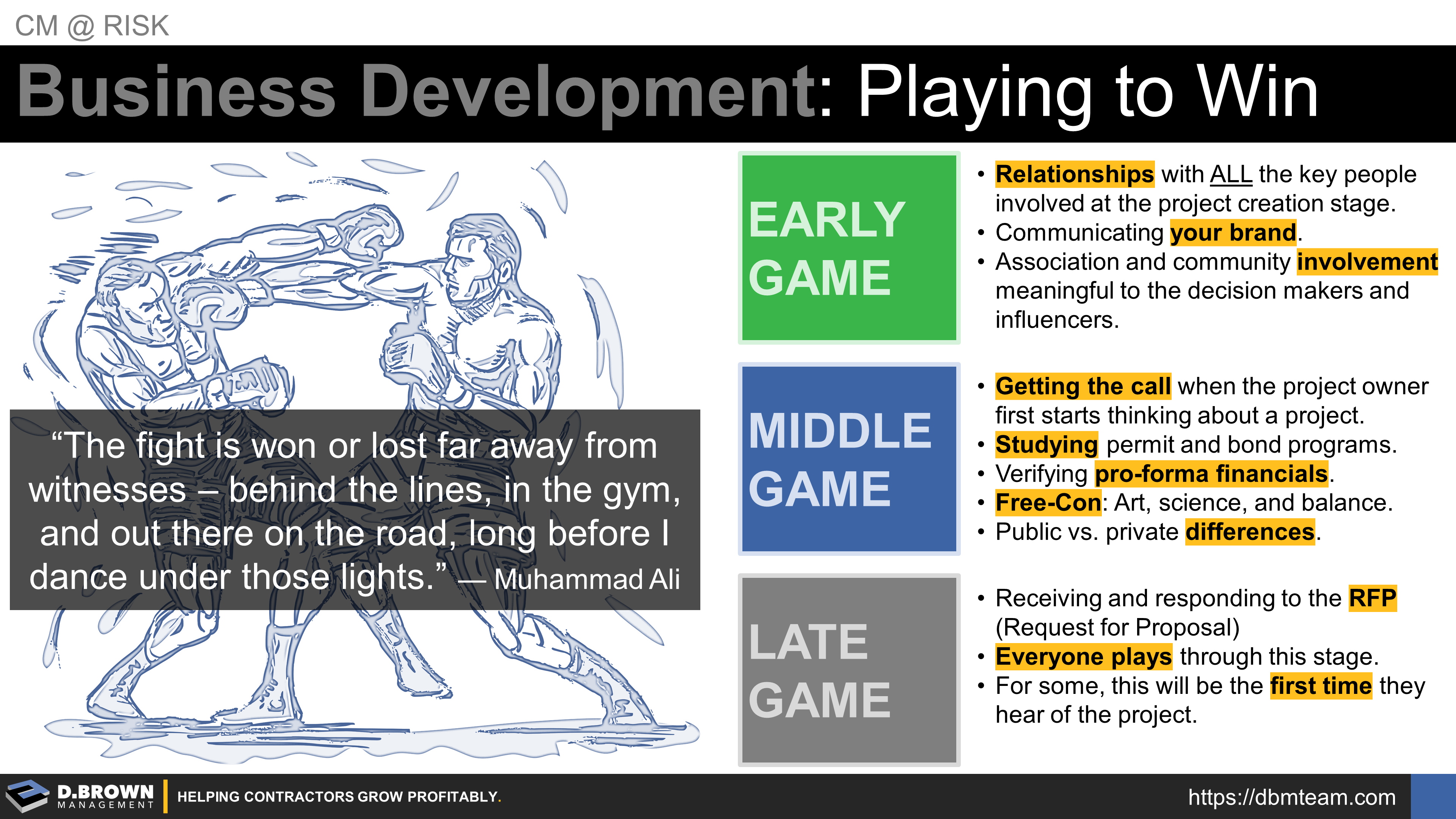 Successfully winning projects starts with knowing all phases of the game. All contractors participate in the "Late Game." Playing the "Early Game" effectively positions contractors to win more frequently, with better pricing, and better terms.