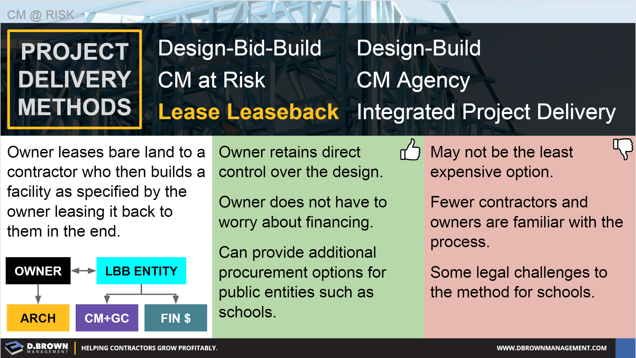 CM at Risk: Project Delivery Methods - Definition of Lease Leaseback and pros and cons.